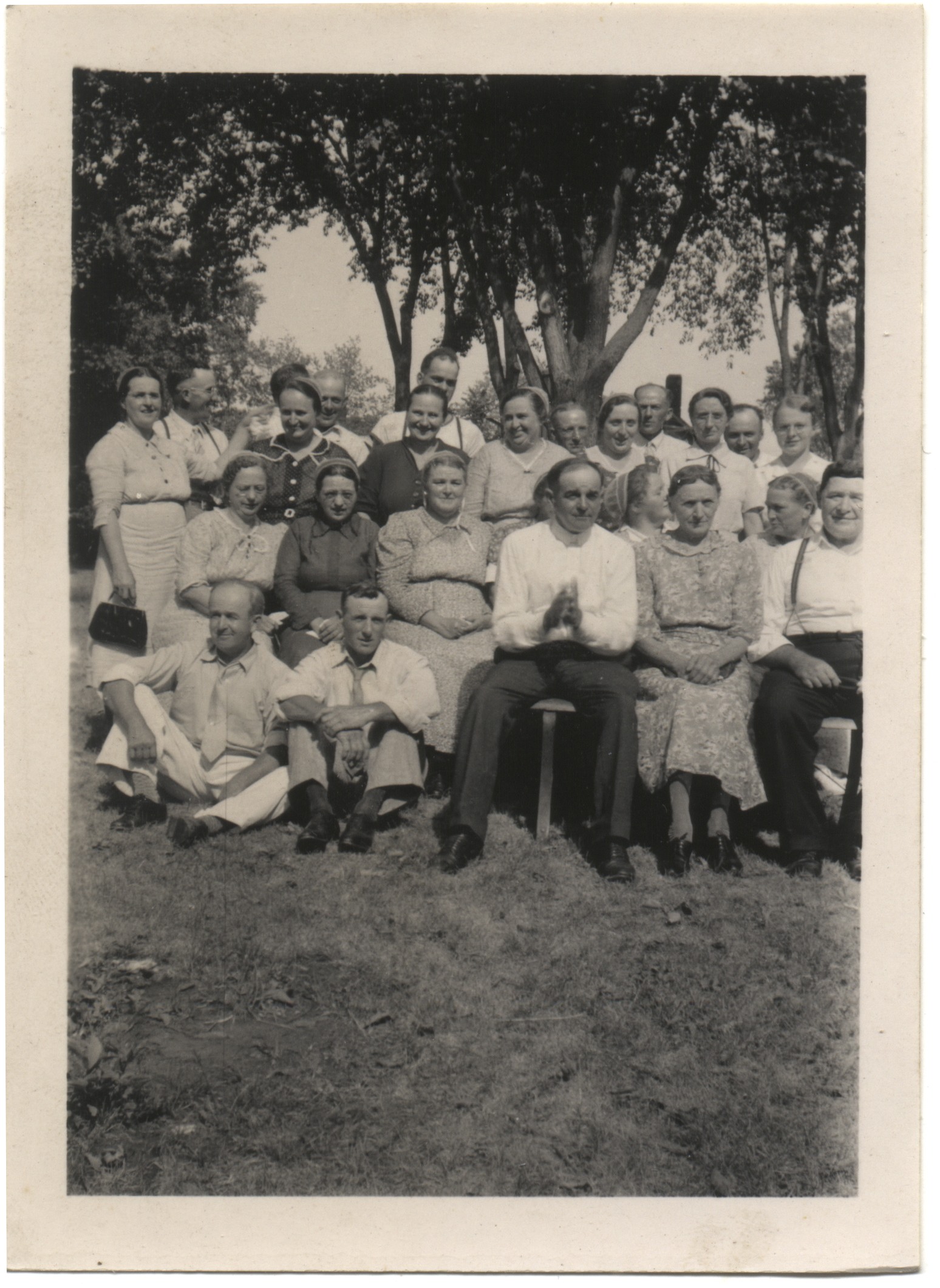 Abraham Swartzendruber Reunion 2 1952c. Katie Swartzendruber 2nd row from front, 2nd from left; dark dress.