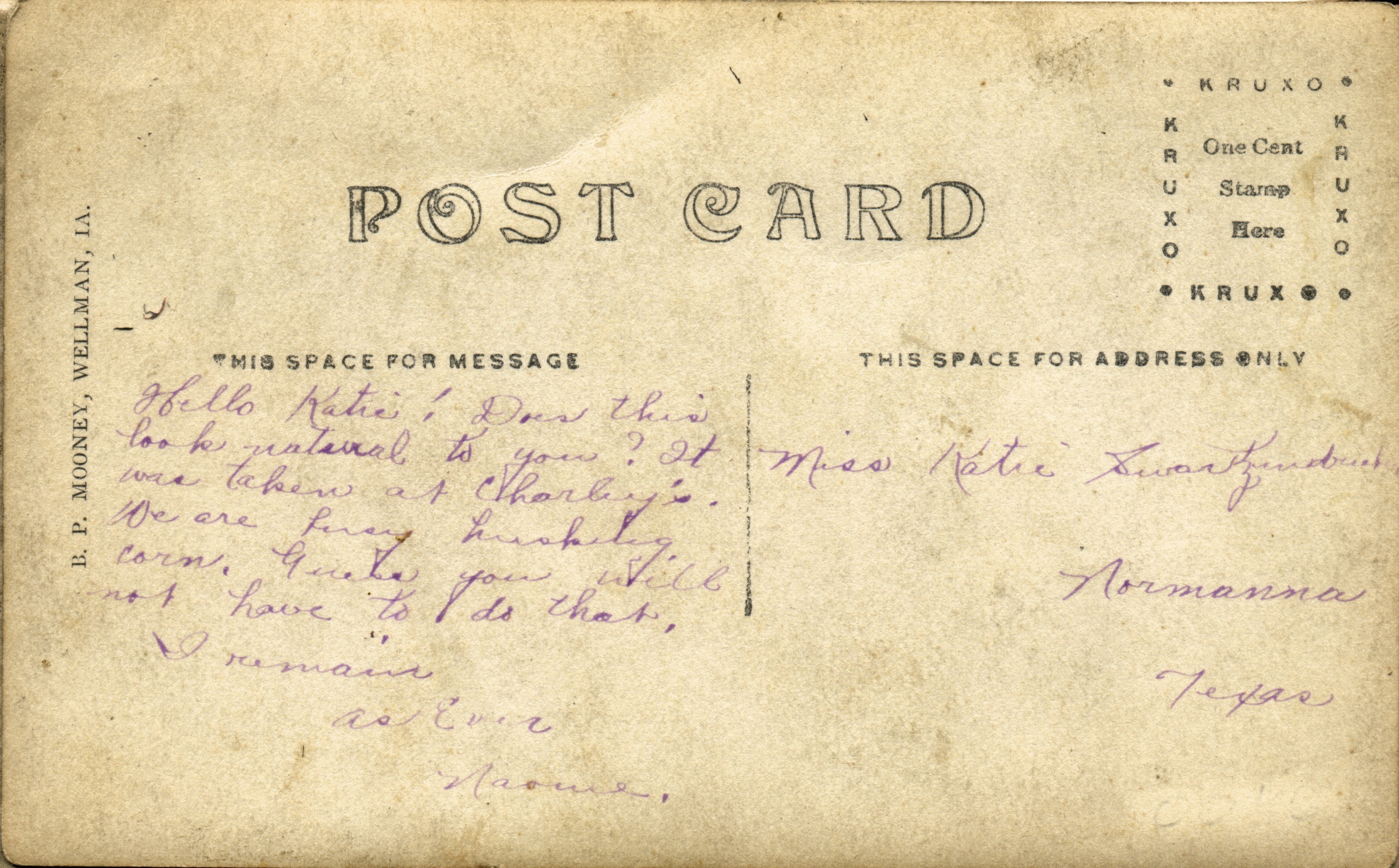 | Sen to Miss Katie Swartzendruber, Normanna, Texas. Hello Katie! Does this look natural to you? It was taken at Charley's. We are busy husking corn. Guess you will not have to do that. I remain as ever, Naomie | 0046B.jpg | Order |