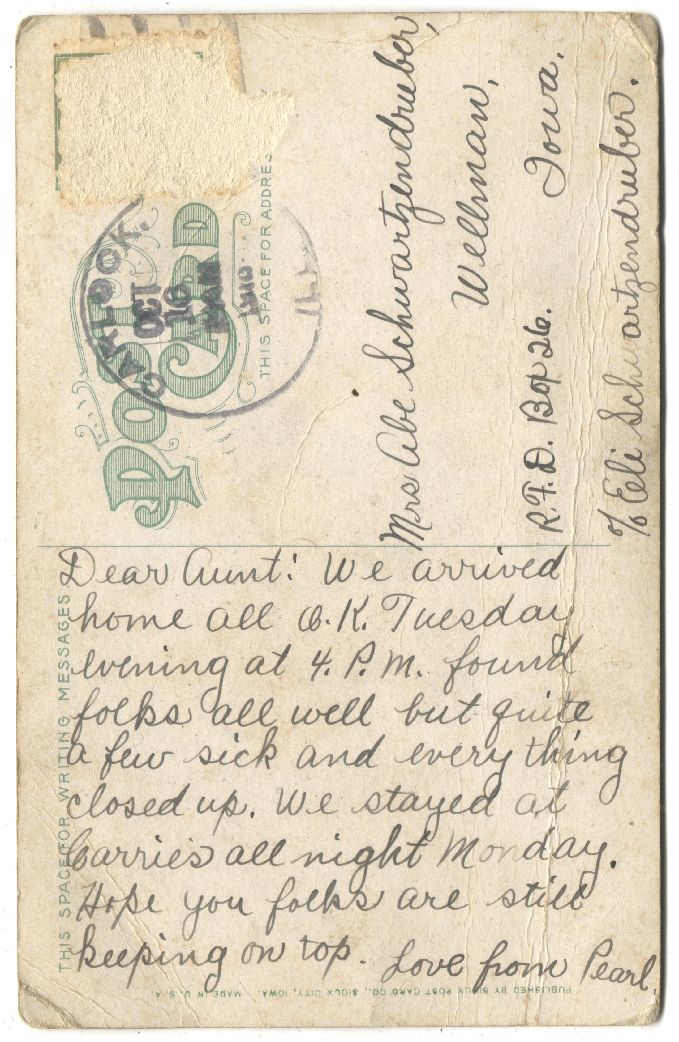 | Dear Aunt: We arrived ome all OK Tuesday evening at 4 pm. found folks all well but quite a few sick and everything closed up. We stayed at Carries all night Monday. Hope you folks are still keeping on top. Love from Pearl. | 0149B.jpg | Order |