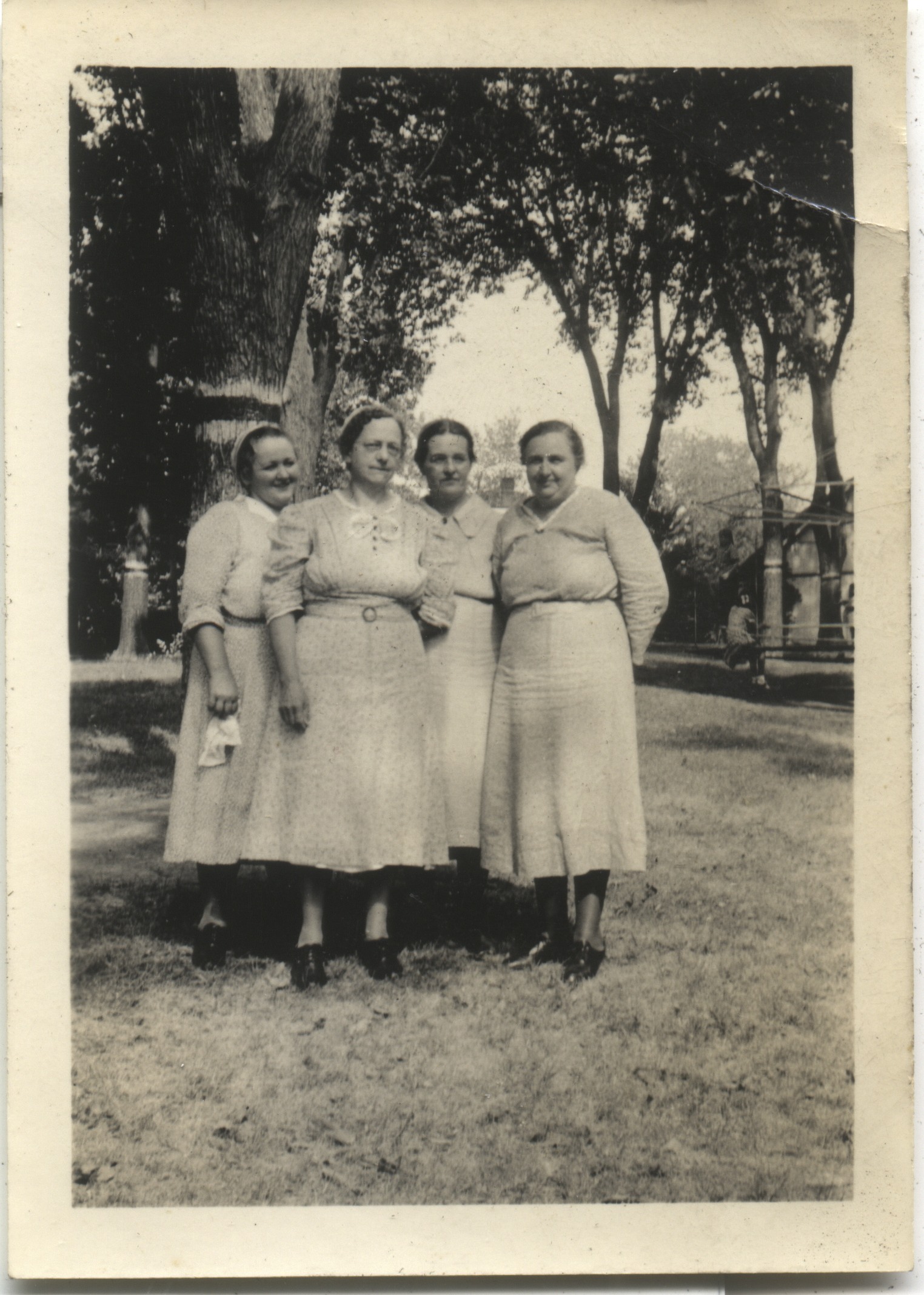 Swartzendruber Reunion. ???, Ruth Schrock, Sadie Marner, Bertha S. Yoder [Marjorie Yoder's mother]. 1920