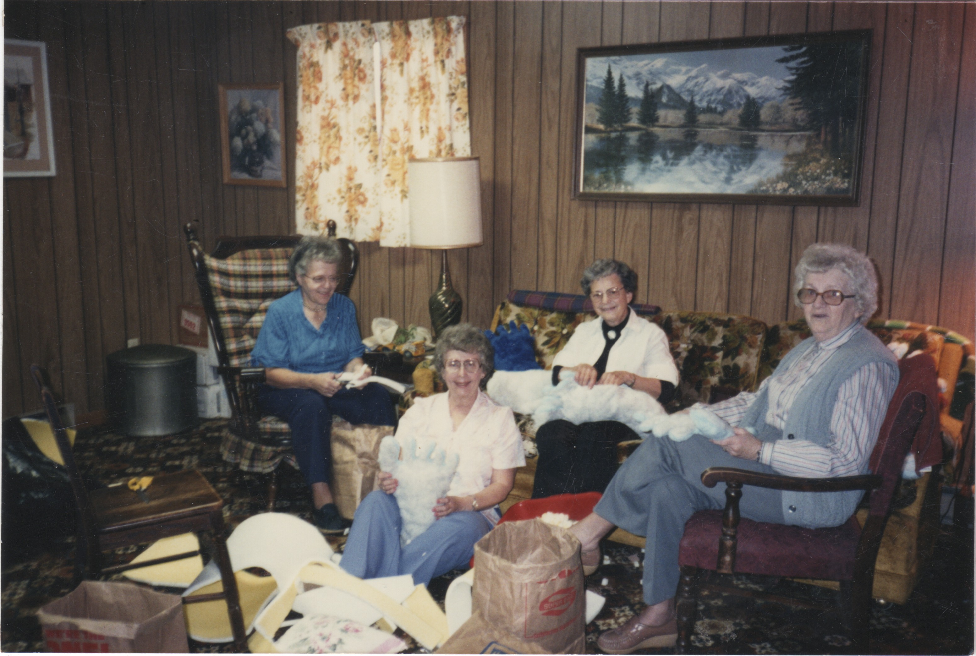 Christmas time making stuffed foot pillows at Francis Hume's home with Mary Kay Gerig, Lourraine Jennings & Edna Roth.