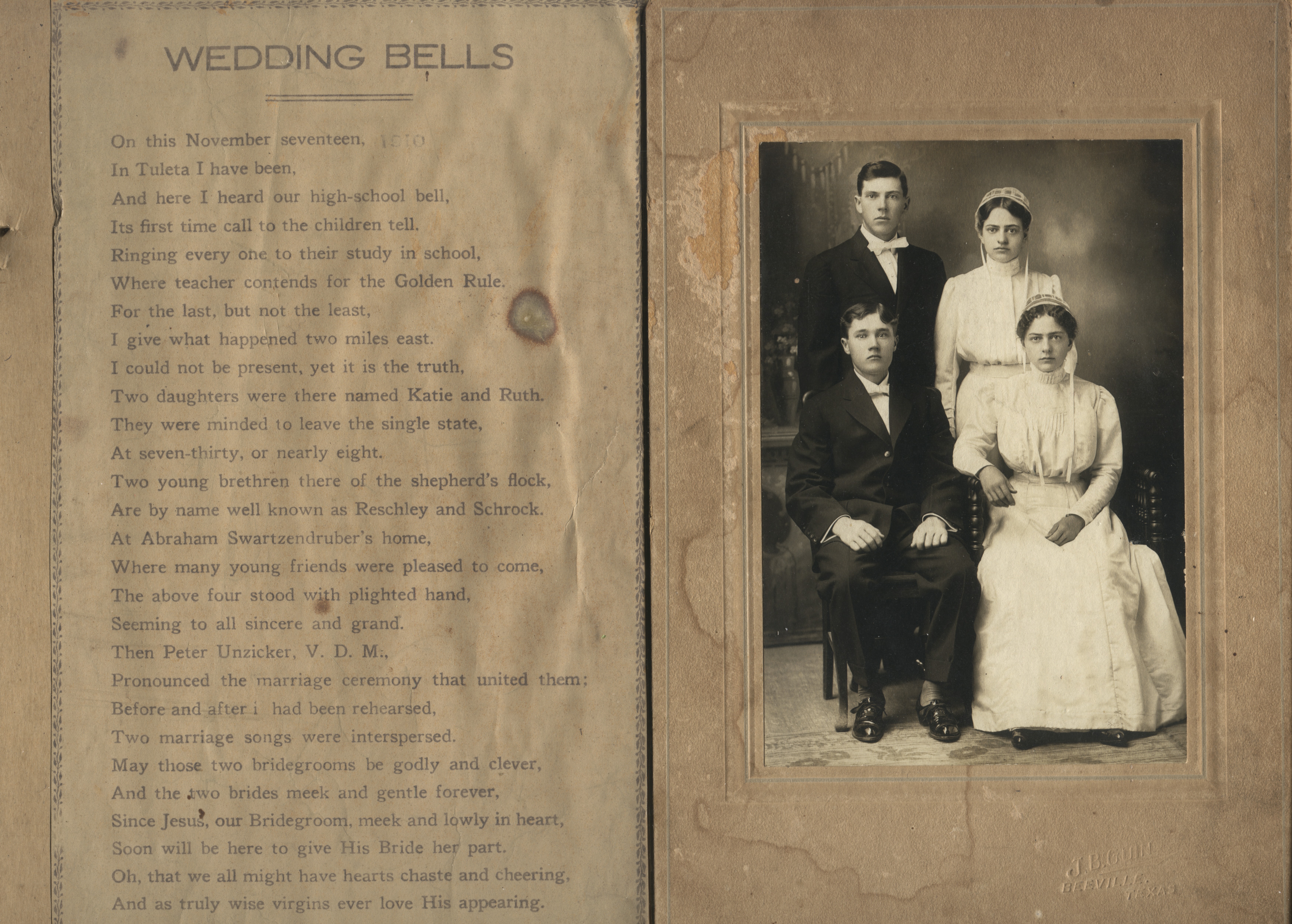 | Wedding Bells Poem & Picture Double Wedding: Katie & Ruth 11/17/1910 The poem was written by Peter Unzinger, and includes the reference I Tim. 4:8 R. J. H. | 0399.jpg | Order | |