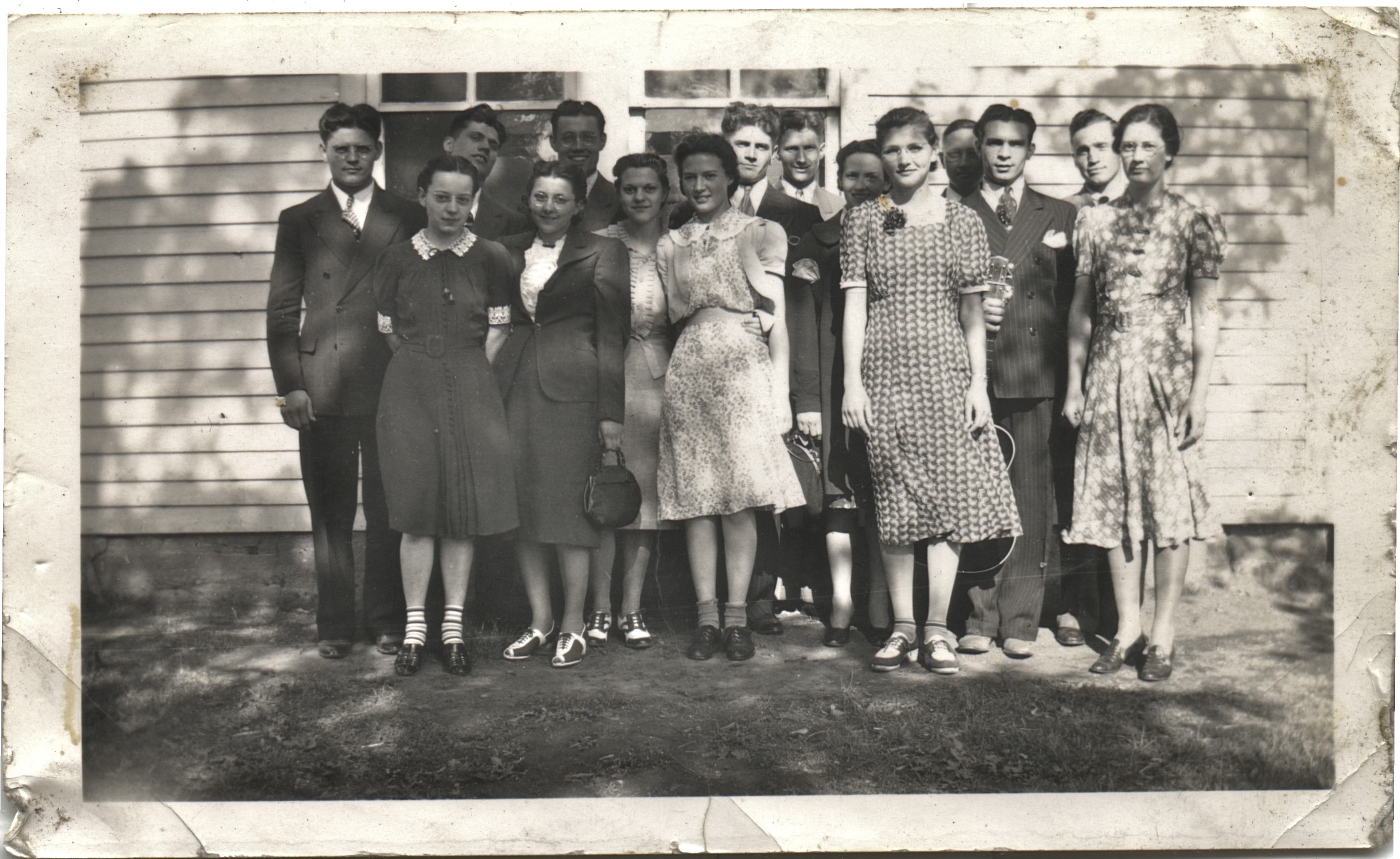 | Gathering for supper before Literary or Sun Evening at Carl Hosttetler's. Left: Murry Kraybill, Edna Reschly, Milburn Kraybill, Mrs. Evertt Roth from Nebr, Marvin Roth, Irene Reschly, Verdella Widmer, Morris Kraybill, Dale Nebel, ???, ???, Henry [Henny] Roth, ? Kraybill, ???, ???. | 0470.jpg | |