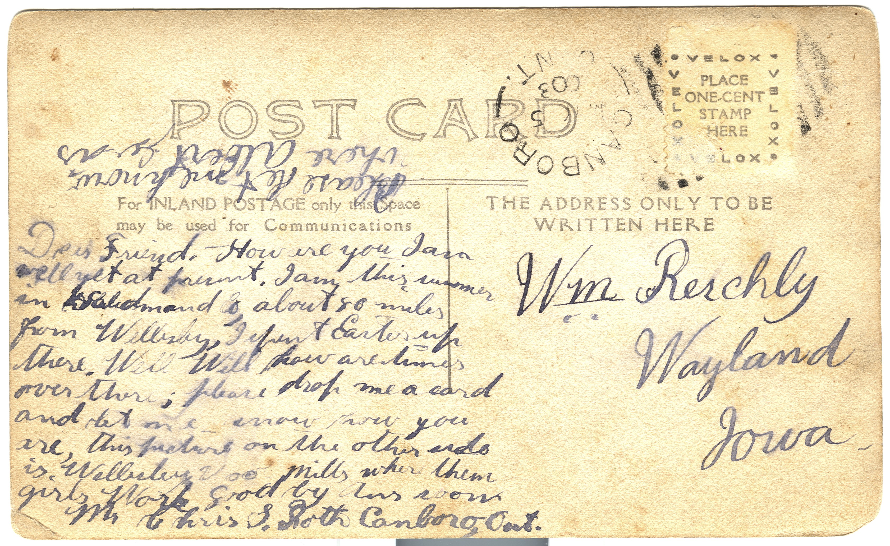 | To: Wm Reschly, Wayland, IAFrom: Chris Roth, Canboro, OntDear Friend, How are you. I am well yet at ???. I am this summer in Walidmandso about 80 miles from Wellesley, I spend Easter up there. Well Will, how are times over there; please drop me a card and let me know how you are, this picture on teh other side is Wellesley Wool Mill, where them girls work. Good by for now. Chris S. Roth, Canboro, Ont. Please let me know where Albert was. 1903c | 0814B.jpg | Order |