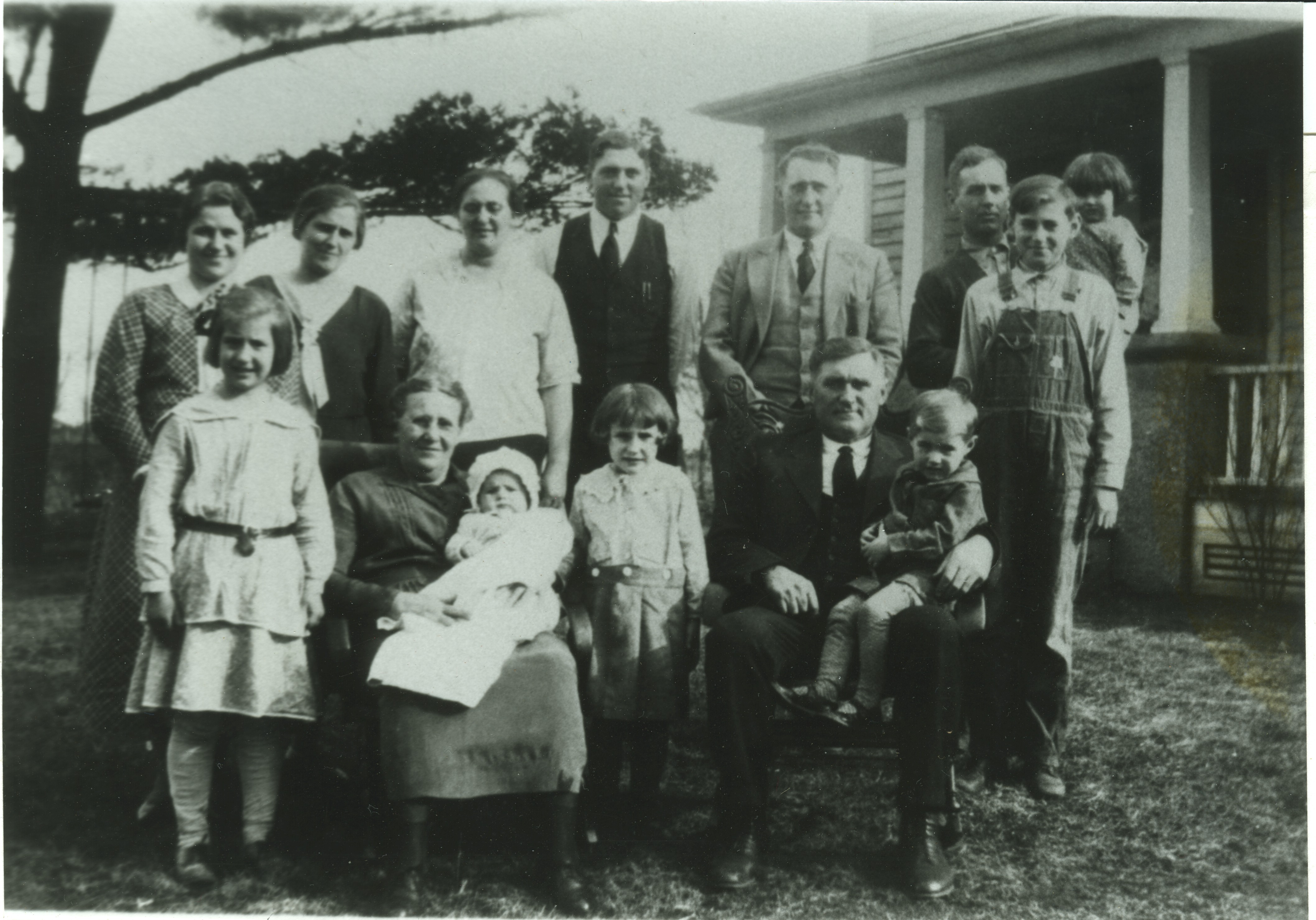 | Joseph & Fannie Roth Family: back left: Elsie, Helen, Mary R. Swartzendruber, Orie, Levi, Earl holding Mariam Swarzendruber, Ray Roth. Front left: Marie Swartzendruber, Fannie holding James, Dorothy, Joseph holding Max Swartzendruber. Taken at the home place. 1932c Scanned from a copy whose original source is unknown. | 1302.jpg | Order | |