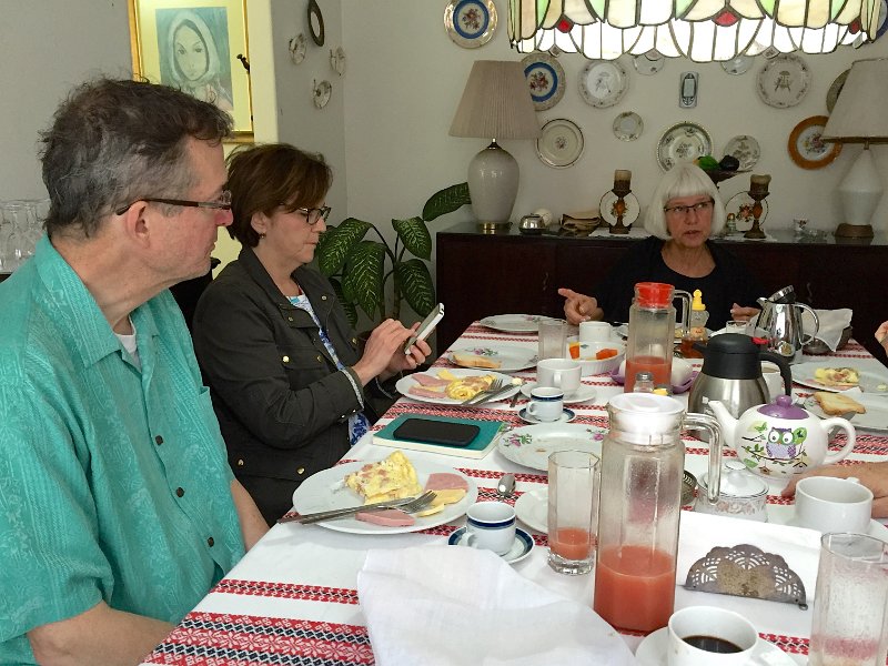 Breakfast. Eggs, taco style, infused with jamon', slices of jamon' on the side as well. Wonderful fruit juice